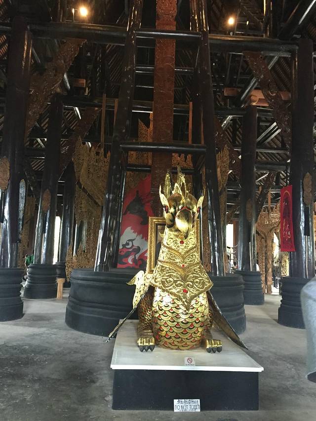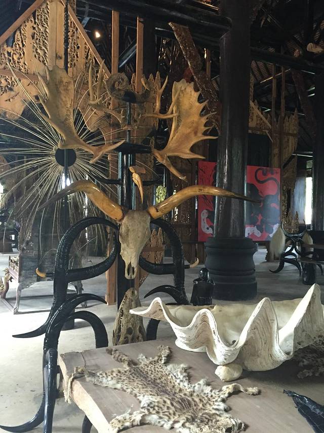 黑庙其实就是一个博物馆,是一位泰国艺术家建造的,Thawan Duchanee,他在那里生活到逝世,获得了公主的嘉奖。黑庙里面陈列的艺术品都是大师收藏以及创作,有一种诡异的美感,漆黑的房屋,各种猎杀工具,动物的皮和壳,还有很多关于野牛的东西,让人感受到一种神秘的压抑与原始的悸动……