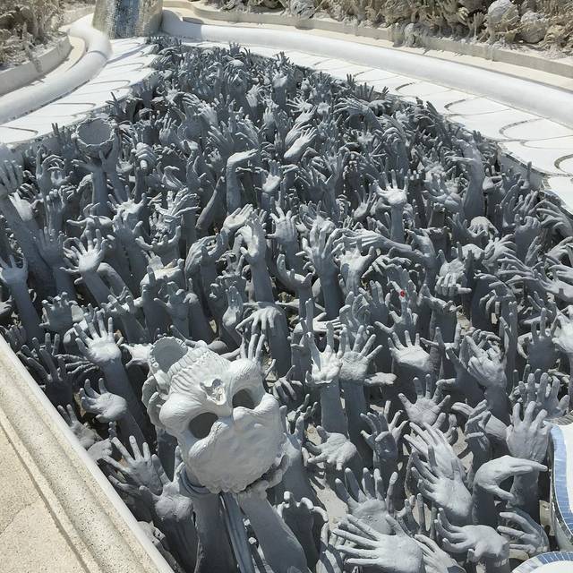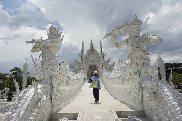 据说黑庙象征地狱,那白庙就是象征天堂。白庙是用白色的水泥和镜片镶嵌而成,闪闪发光,非常漂亮。白庙里面有个黄金厕所和白银厕所,金碧辉煌,真的非同一般哦~而且白庙不仅仅展现了过去,还显示了现在和未来,是一座很独特的寺庙,设计师和画工们超级可爱,大殿里面的壁画有蜘蛛侠,哆啦A梦,恐龙,怪兽等等好多新元素~