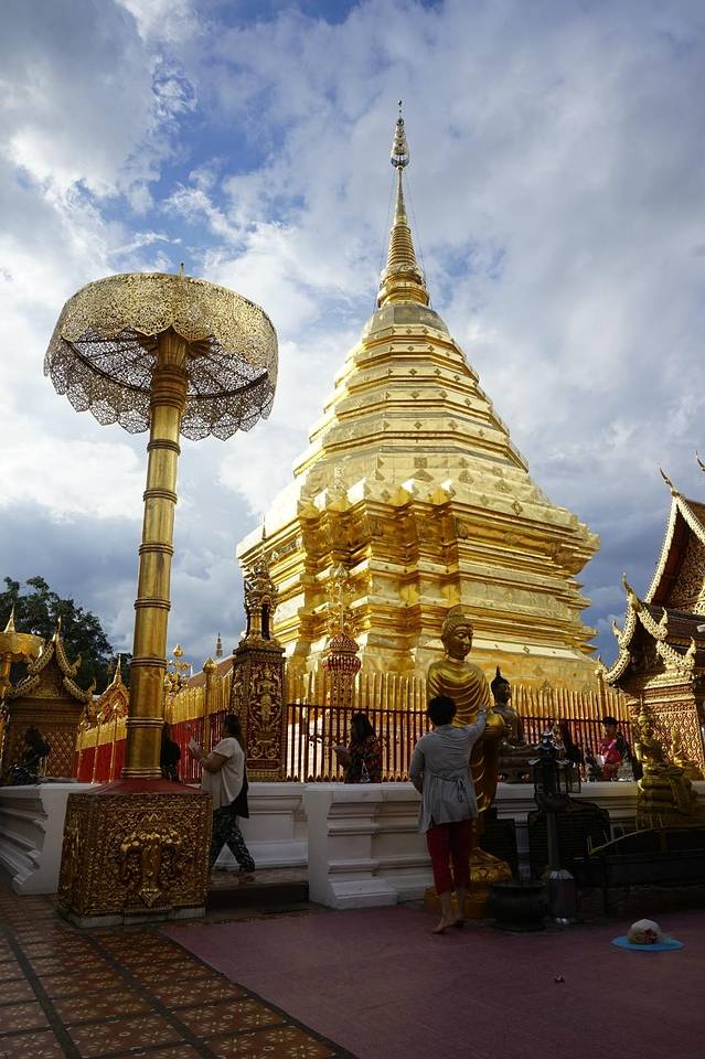 素贴山上去得买门票,走路是30泰铢,坐缆车上去一起是50泰铢,其实山不高,缆车就像电梯一样,但是因为太累了,我们决定坐缆车上去,然后走下来~泰国的寺庙进基本都需要脱鞋进入,双龙寺是一进去就得脱,所以最好不要选择太阳太烈的时候,脚会非常烫……我们当时过去是四点多五点,太阳已经慢慢落山,所以没有那么烫……寺庙很漂亮,金碧辉煌,很多善男信女,点香,烧蜡烛,供奉鲜花,给高僧点播,洒圣水~泰国寺庙在大殿供奉一般都用鲜花多,非常环保,只有在外面才烧香和蜡烛,感觉环境比中国烟雾缭绕的寺庙好太多了……