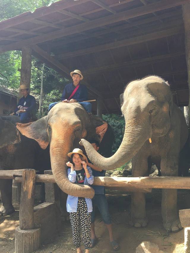 今天是在某宝定了美莎大象营和丛林飞跃一日游,导游说早上7点10分来接我们,结果我们起来大早,一直等啊等,等到8点多才来,我几乎都要回去再睡一觉了……接我们的车是丰田商务车,一车大约十个人,感觉还挺舒适,起码没晕车~~美莎大象营离清迈古城不近,我们的导游是个小胖子,中文说得非常好,大象营的行程很简单,骑大象,喂大象,看大象表演,完了……不过大象超级可爱,虽然有点臭臭的,但是感觉个个都相当活泼,会问你要东西吃,不给就喷水,你给主人小费,它会帮你卷上去给主人~而且大象非常聪明,会画画,踢球,要是踢球踢中了,还会跺脚,甩鼻子,高兴地叫~有一个项目是找个观众跟大象比赛用飞镖扎气球,那个观众扎中气球了,大象也用鼻子甩飞镖过去扎中,观众没扎中,大象也故意不扎中,后来观众乐了,几下把气球都扎爆了,可是大象还有几个没扎中,就是不肯走,等主人把气球都扎爆了,才肯走~大象画画还挺艺术的,画完了会自己拎着颜料箱走,跟个小朋友似的~骑大象的时候象夫会帮你拍照,要记得给小费哟~然后也会有人专门帮你拍照,配上象粪纸做的相框,每个200泰铢,我跟老颜都买了~