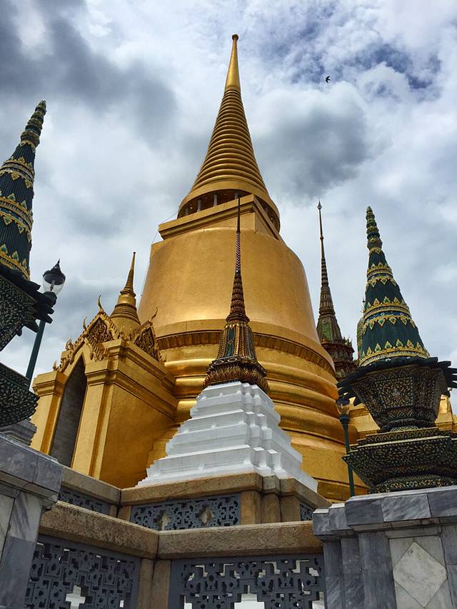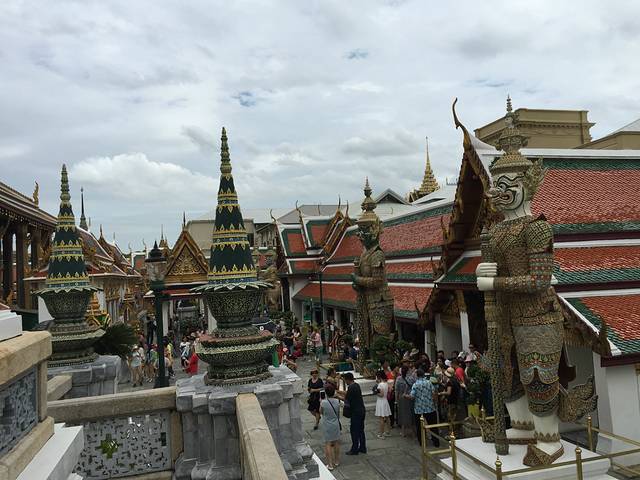 第六天打算是去大皇宫郑王庙,晚上预订了白兰花号游船,做好打算心里美美的出门了~住在湄南河边的优点是可以坐水上公交,那么,问题来了,码头怎么去呢?打开手机地图,导航,我去,居然让我们反复过马路,走天桥,兜来兜去,太不靠谱了!!!!最后折腾了好久,才找到码头,其实就是出酒店巷子口右拐直走,在天桥下看见一个当地人的健身公园,然后往里走就到了!!!不过十分钟的路程啊!我们折腾了一个多小时…… 到了码头,先花3泰铢坐船到对面去,然后坐公交船去大皇宫。码头有好多人兜售游船票,100泰铢一个人,其实不是那个哦,是要坐公交船,有橘色旗子的15泰铢,但是我们坐上了貌似蓝色旗子的,比较好的船,40泰铢一个人,沿途有人介绍到达点,当然,是英文和泰文的介绍,但是听得懂码头是哪个就行了……大约三十分钟,大皇宫到了,下了船,跟着人流走,人哪里走最多就往哪里走,大约十多分钟,到了大皇宫……大皇宫要买门票,500泰铢一个人,其实感觉很贵啊!但是不进去也很可惜啊,所以买了,里面建筑很多,也是富丽堂皇的感觉,壁画说的是夜叉国国王抓了人类皇帝的美丽妃子,两国大战的故事,画得非常写实而细致,慢慢看,有种细思极恐的感觉。大雄宝殿非常庄严,里面有价值连城的玉佛,不允许拍照,有个跟着泰国女人的老外用手机拍照,结果被抓,手机被收走,后来怎么样就不知道咯,总之,到别人的地盘上,就要遵守别人的规矩和信仰吧……