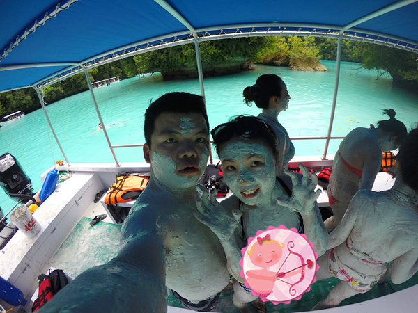 上午带我们到了牛奶湖,其实并不是湖,也是一片小小的海域,在古代,这里是火山活动频繁的区域,火山喷发后的火山灰沉积湖底,长年累月,形成厚厚一层火山泥,据说这货是美容佳品,那我们当然不能错过啦,NORTON下水捞了一桶泥上来,一个个都把自己涂成了泥人,涂在身上凉凉的,还挺舒服哈