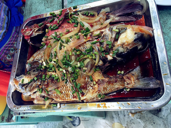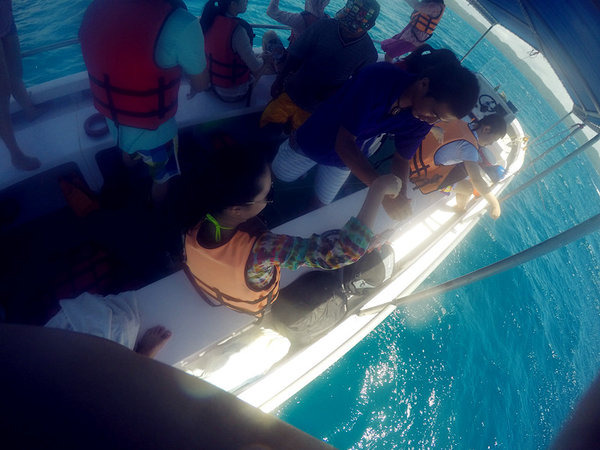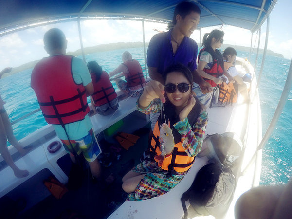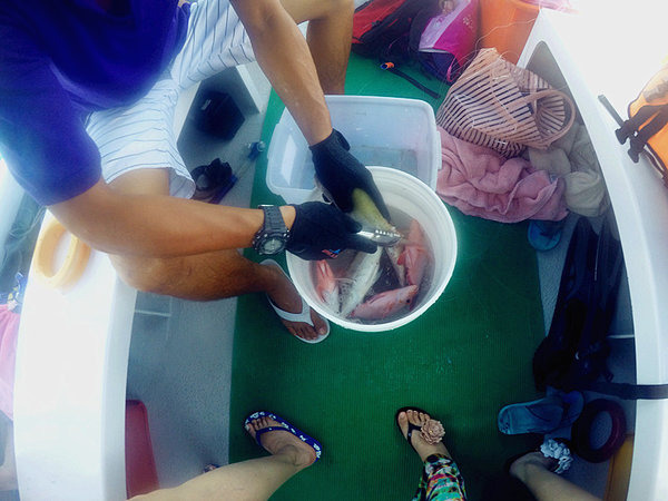 出海第一项活动:海钓。NORTON说中午吃什么,就看大家的收成了。我钓了2条,老公一条都没钓到,哈哈,运气好好,海上钓鱼全凭运气跟手感,在这边钓鱼都是手钓,直接放线到水中,用手指关节处的缝隙感受鱼线的变化,能明显感受到鱼在咬饵的感觉。当然还有船长的经验,如果把船停在鱼多的海域,就等着收线好了,我们全船钓上来20多条鱼,光船长一个人钓了6.7条,中午可以饱餐一顿咯