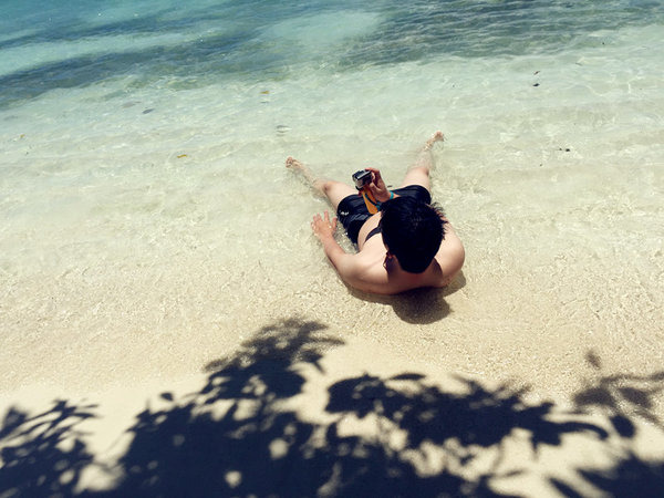 虽然很困,但是看到如此美景,还是来一张吧,灼热的阳光照在身上好像也没那么累了,这个时候国内正下着雨,天阴冷着,想想就值啦,哈哈哈哈,什么航班延误,算什么,马上就能去海里撒泼玩啦