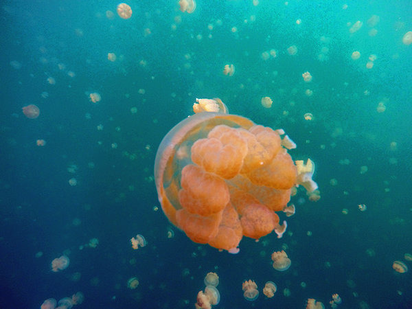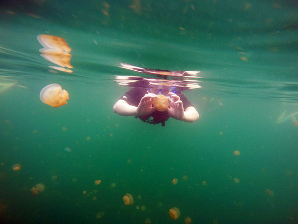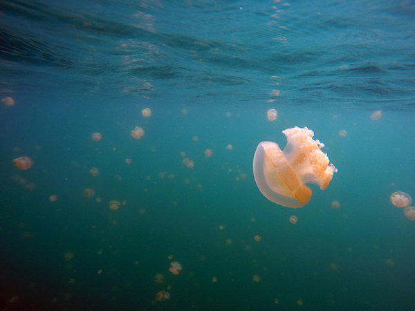 就是这些治愈系的软绵绵们,是不是很有爱,水母湖是帕劳最具特色的景点。在数万年前,水母湖曾是海的一部分,由于地壳运动,周围的海床升高,逐渐将它与外海隔绝,形成了一个看似普通的内陆咸水湖。湖中大多数海洋生物都随着养分的消耗而消亡,只剩下了一种低等、靠少量微生物就可以生存的海洋生物——水母。由于天敌们的消失,这些水母“遗失”了祖先用以防身的武器——身体内的毒素。这样,帕劳水母湖拥有了世界上独一无二的无毒水母。