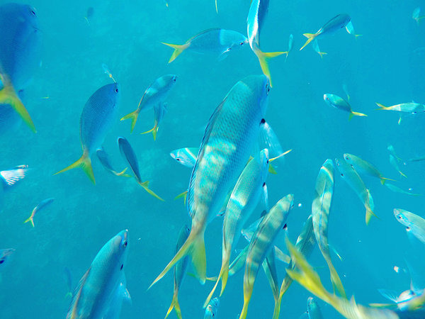 光听就觉得很惊悚了好嘛!!!我们一个个都小心的拉着NORTON的浮板,尽量让脚浮在海面上,虽然带我们喂的是黑鳍鲨,一种很温顺的鲨鱼,但是谁能保证他们不会好奇的跟我们来个亲密接触