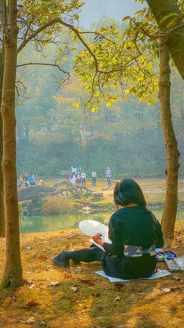 早上来写生的美女.无视来来回回的路人.