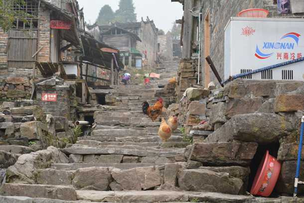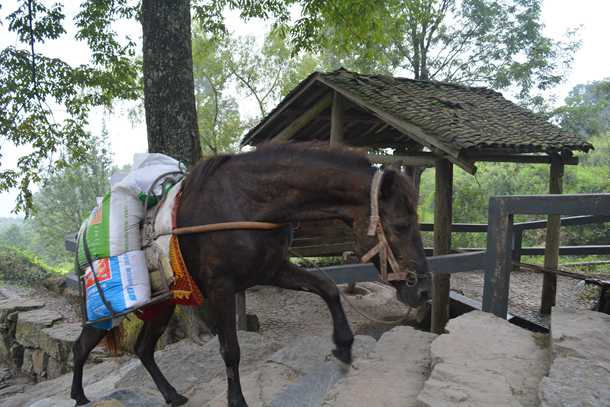在瑶寨里面,瑶民放养的鸡随处走着,还有瑶民喂养的马用来驼东西来减轻自己来回登山的辛苦。