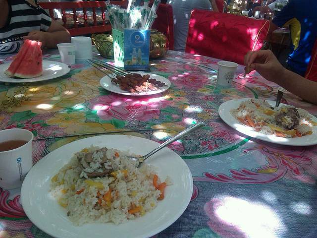 在吐鲁番吃饭很好找,广场喷泉西侧就是夜市,吃饭环境挺不错的地点,烤羊肉5元一串,格瓦斯5元一大杯,有非常诱人的砂锅、面肺子、黄面凉皮、胡辣羊蹄。