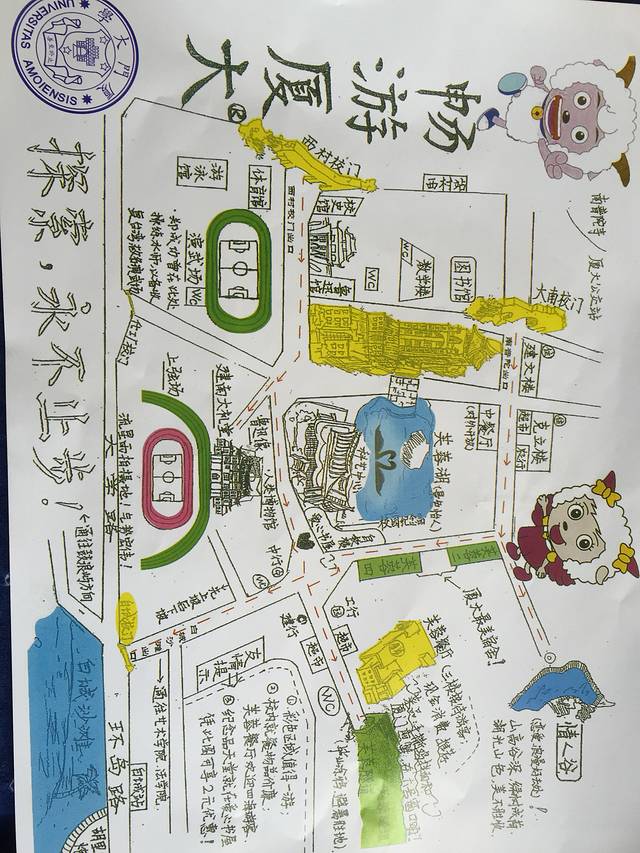 从曾厝安到厦大打车就10元的车程,到了门口凭身份证排队进校,不收门票,但是周一至周五限定开放时间,我们刚好遇到周末,因此没有受到时间限制,去厦大的朋友要注意出行时间,以免白跑!门口买的这幅地图,看完觉得太贴心太有爱了,谁画的,必须100个赞👍