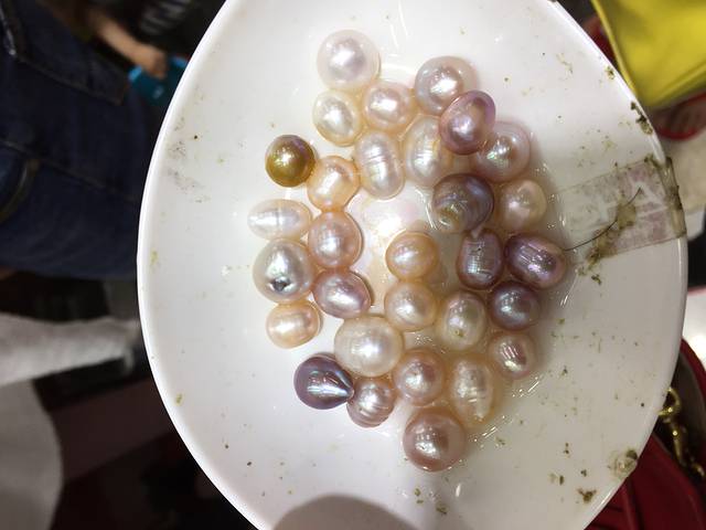 我自己挑的贝壳开出来珍珠还不错,现场加工了戒指和手链,提醒大家千万不要加工,珍珠拿走就好了,给妈妈加工了枚戒指,戒面200多发票是银的,妈妈带了半个月就褪色了,坑爹啊,还好不是送人的,喜欢就把珍珠带回来找信得过的地方加工!
