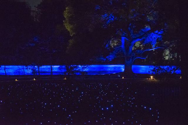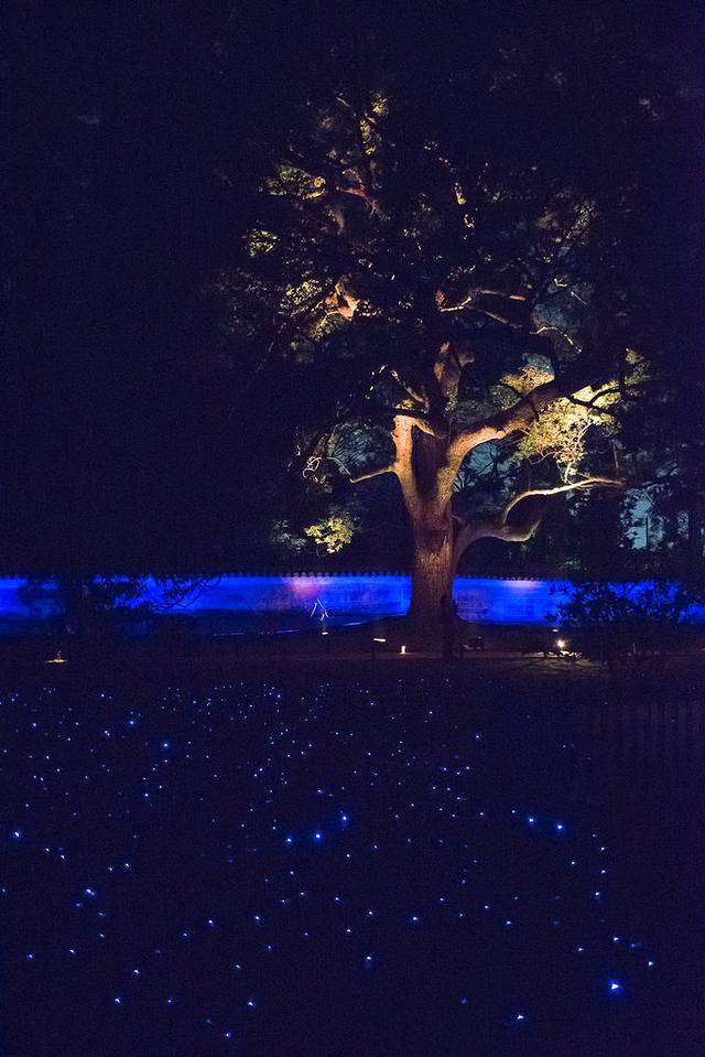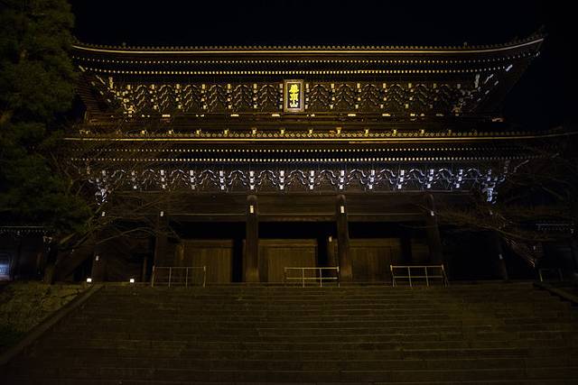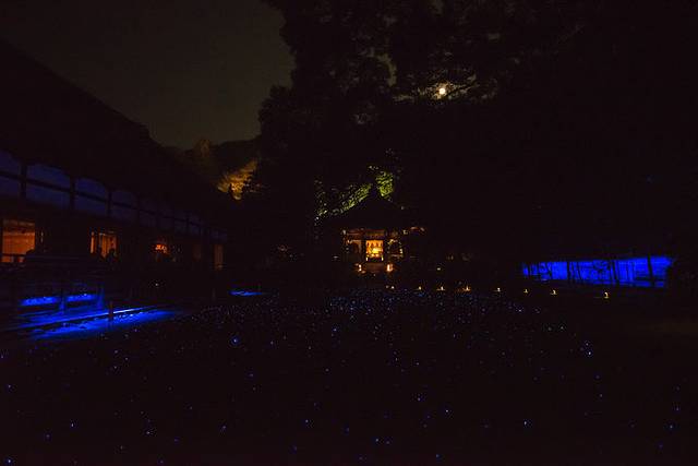 下来没走几步就是青莲院,以高大的樟树而闻名,夜场票不便宜,800一人,也得买呗,鱼贯而入。一路上道路两旁、树上、草地上都精心布置了led灯,闪烁着摇曳的光芒,很新奇的视觉感。最重磅的是到大殿里,正对大殿的草地上铺满了各式小灯,有顺序的变幻着各种组合,坐在台阶上,在黑暗中,感受那些灯光的绮丽,日本人所说的那种冥想的境界似乎有所领悟了。