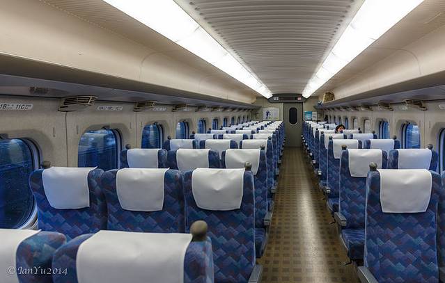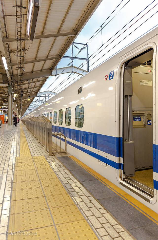 拿了票性子急的我直奔站台,由于买的是自由席,深怕这三四个小时就要在站立中渡过,赶忙去指定站台排队抢位置。新干线站台就比较高级了,头顶上的电子公告牌滚动播出即将到达的列车,很是清晰方便。到的太早,我们这班ひかり510号前还要好几班列车,等到这几辆走光,我们就排在第一个啦,给力。日本的列车么都准时的可怕,更何况是新干线,我们的车掐着点就进站了,好家伙,空荡荡的车厢,我们四人又包场鸟,果然是早起的鸟儿有福享啊。
