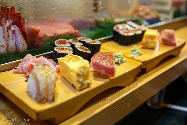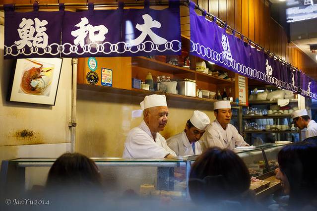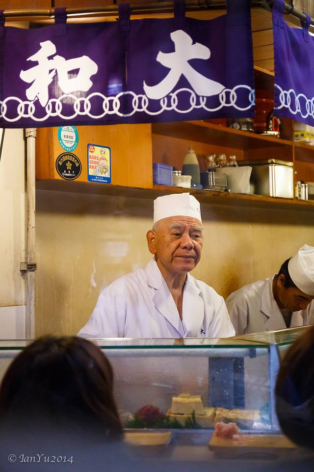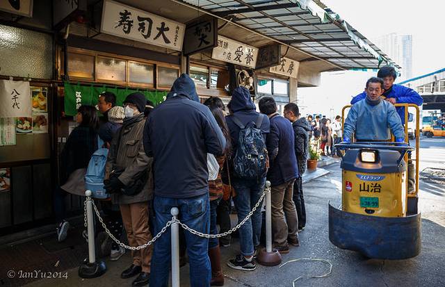 剩下的就是无尽的等待,在肚饿中等待,看着鱼市的人开着桶状的车在人群中穿梭,牛逼啊。看着更多人的姗姗来迟,惊异于眼前的人山人海,感叹于今天有可能就排不到的窘境,哈,心情大好。大和寿司风评略低于寿司大,主要不是因为味道,据传是因为做寿司的师傅不够严谨,有时候会禁止拍照甚至吃完赶客等。事实是不是如此呢?只能说大和寿司的移动速度是寿司大的N倍,每隔十来分钟能往前动一动,而反观不远处的寿司大,我觉得排在那里的每个人都是牛人,它的队伍基本是不动的……以至于到了后期,队伍每次快速的移动一阵,LG都要说,好了好了,大和寿司又开始擦烂乌了,哇哈哈哈。