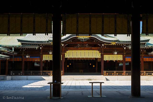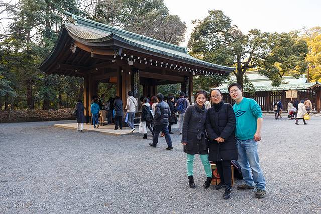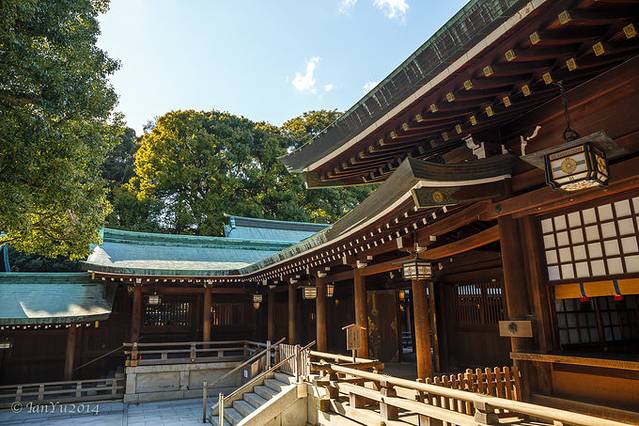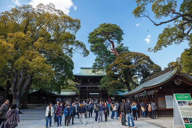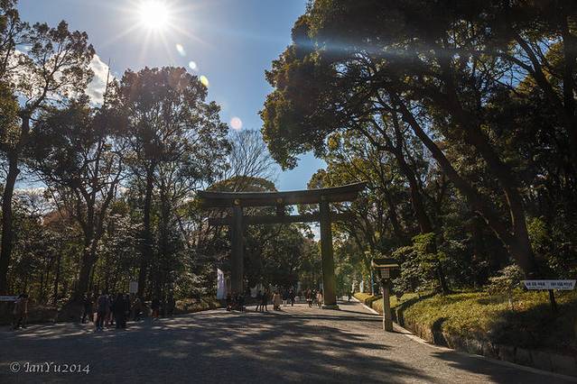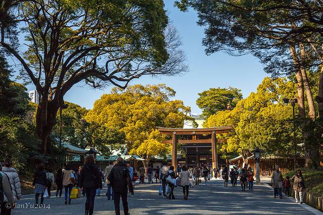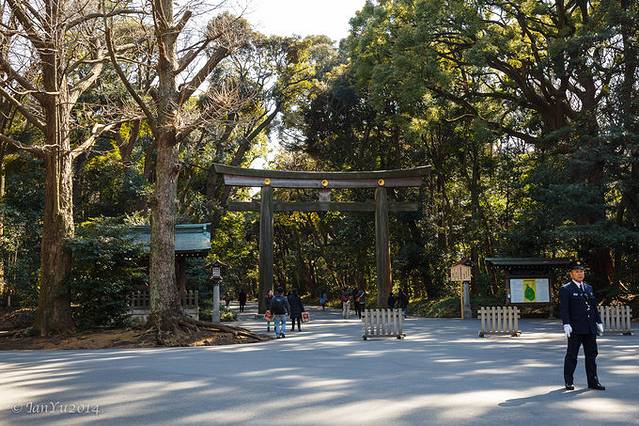 吃完继续行程,正经一点,去个景点吧,明治神宫去也。据说运气够好的话,能看到举办传统的日式婚礼哦。我们去的时候正是日本的一个小长假,我相信这种可能性还是很高的啦。池袋可以搭乘副都心线直接到明治神宫,买了地铁套票就是好啊,随便坐啊。但注意这里是坐到“北参道”比“明治神宫前”更近兜起来更顺路哦。下来没几步路就看到巨大的鸟居,鸟居后就是神的地盘了,好像是有这种说法。碎石路,参天树,虽然那天天气阴阴的,但走在里面依然觉得怡人,环境很不错,不愧是供奉天皇灵位的地方。