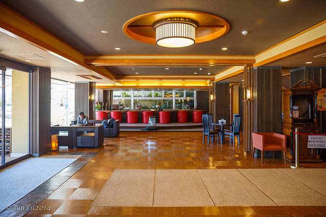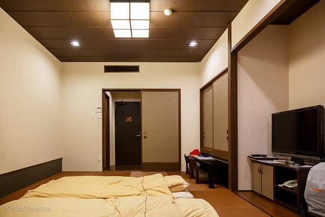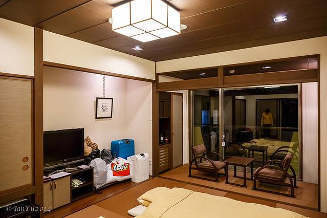 到酒店车程不远,但要是靠走的也完蛋了,所以大胆的来让酒店接吧,这里的温泉旅馆基本都有免费接送的哟。到达后,有专人给我们送来问候饮料,以及专门讲解旅馆的各项设施,立即预订了晚上7点的晚饭和明早8点的早饭,才才,总算没浪费这两顿饭哟。接待小姐的英文不错,什么地方泡汤、浴衣怎么穿、换鞋的规矩等都讲解的清楚易懂,很不错。我们各进各房,哇塞,虽然也是全榻榻米的,但和我们京都住的民宿一个天一个地啊。房间更大更宽敞,厕所浴室分布合理用品精致,落地窗,小茶几,我脑海中的日本就是这样啊。好赞好赞,等着明天早上的富士山啦,接待小姐讲,明日 いい天気だ!