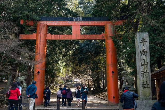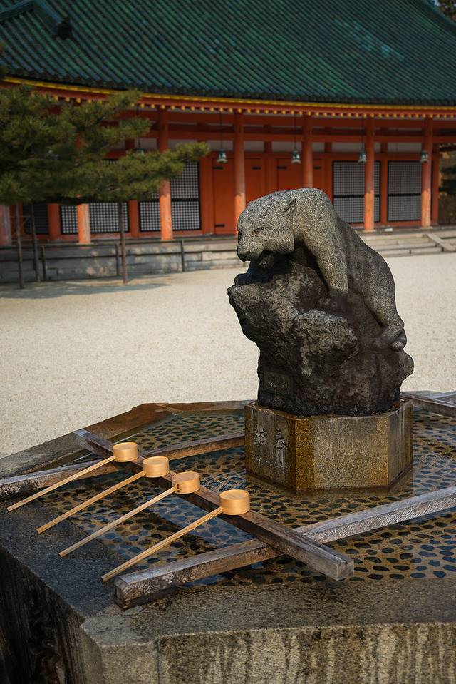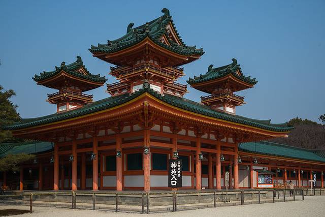 出来看到车在踏实了,继续行程,下一个是相距不远的平安神宫,远远就看到那个超大鸟居,以及红的艳丽的建筑群,到了门口扫地的工作人员立马指示停车地点,甚好。在门口洗了手,超越一个台湾团率先进入空荡荡的神宫。左右对称的建筑群颇见气势,小石子路走上去咯吱咯吱,在安静中慢慢欣赏挺惬意的。据讲是京都人民因为明治维新定都了东京,颇感打击为了复兴京都而修建的,所以确实在所有建筑中看上去是最新的。