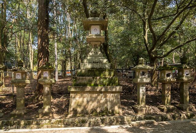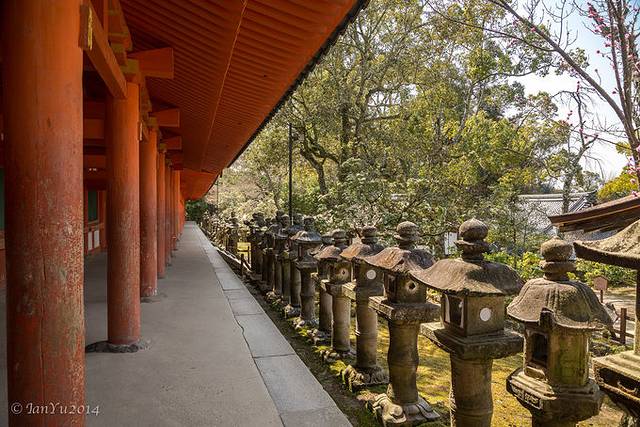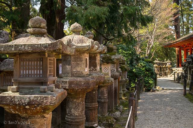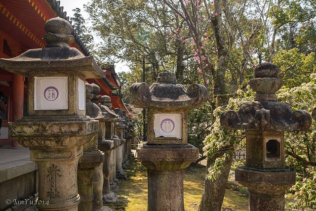 春日大社还是很有自己特色的,门口的石灯笼长长的一排,左右望去非常奇妙,据讲社内共有3000座石灯笼和吊灯笼,也是让人供奉的,不知道和伏见稻荷的鸟居是不是一个意思?话讲日本是个多宗教的国家,寺庙供奉的是佛,而神社则是神道教,什么神都有,动物、人、妖怪都有,要复杂的多,非常的有日本特色,我是这么粗浅区分的啦。哦,还有神社是不要门票的,寺庙要门票,啊哈哈哈哈。