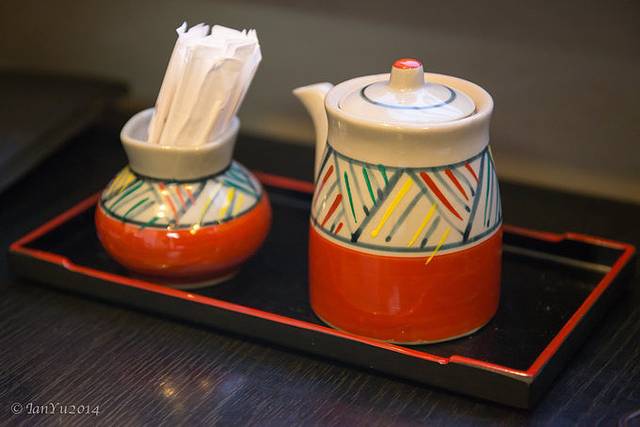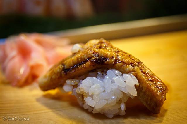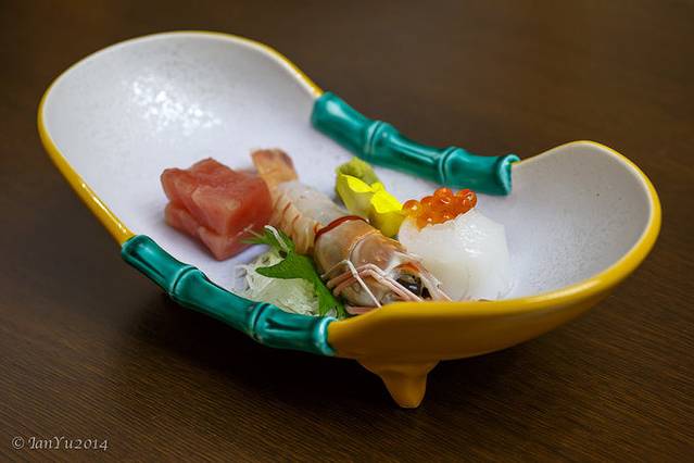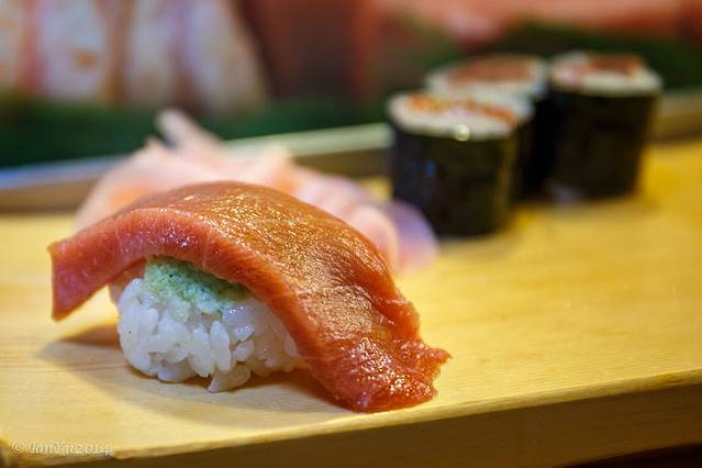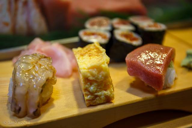 但即便如此,我们四个坐到那个背着双肩包都坐不下去的位置上时,已经接近8点半了。温暖的室内,喝一口抹茶,感动的差点老泪纵横。大和寿司是吧台位,每个人面前放一个木盘,师傅捏好了会放到这个竹盘上。两个师傅分别照顾两头,还有个人负责配料,分工倒是合理。正对着我们的这个师傅年纪较长,慈眉善目,对着十三组的年纪较轻,会说些怪话调节气氛。不太爱吃生食的十三同学被他卯老一直催促他一口吞掉,非常搞笑。