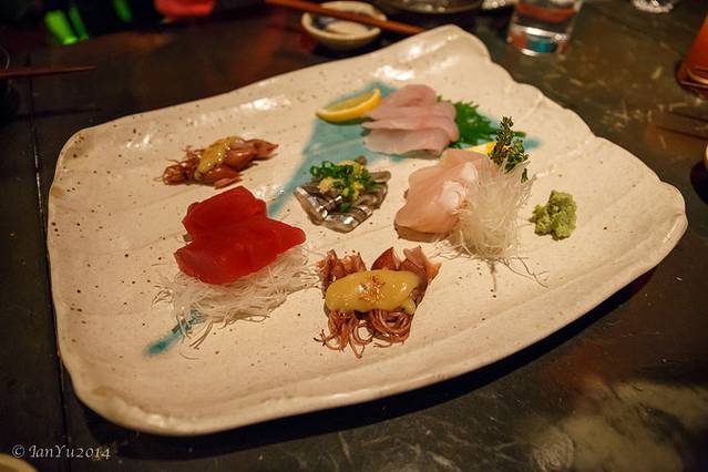 其实上野到银座很方便啦,银座线一部头没几站,只是东京地铁分了東京メトロ和都営两家公司,所以买票的时候要注意区分,两家公司的售票机不通用哈。银座果然如老姐所说没有天朝来的灯火辉煌,以至于她一度认为日本在灾后节电,哇哈哈哈。但银座却是美食的聚集地,事先发来的几个备选餐厅个个看得我口水横流,最后我们的目的地是银座板前 BAR 一八,看宣传是有啥地方新鲜直送来的鱼生哦。结果那天鬼打墙,几个人在店门口全部瞎眼,反倒是发现了另外一家备选餐厅,正要改旗易帜之时,一八同学终于出现了。