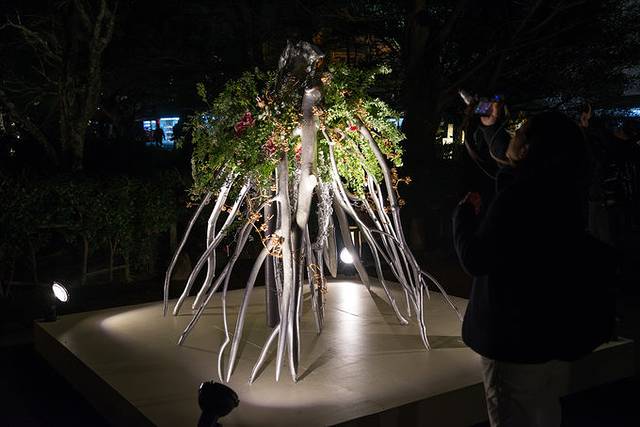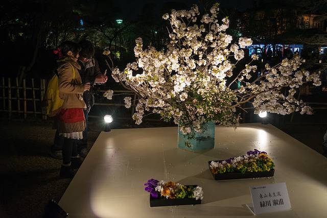 慢慢顺着参观步道而出,就是一直延伸到清水寺的花见路了,车辆全部禁止通行。尽职的日本交警在路口挥舞指示棒拦阻过往车辆,行人则顺利通行。这点又要表扬小日本了,这种庙会、灯会性质的活动在天朝也不少,但是弄得那么雅致、那么有情调、那么干净、那么静静地展示,就是一种本事了。沿路两旁都有各式泛着黄光的小灯向远方漫去,有种朦胧感,五步十步的就有个插花艺术展示,同行的摄影爱好者大喜,不断的按下快门。
