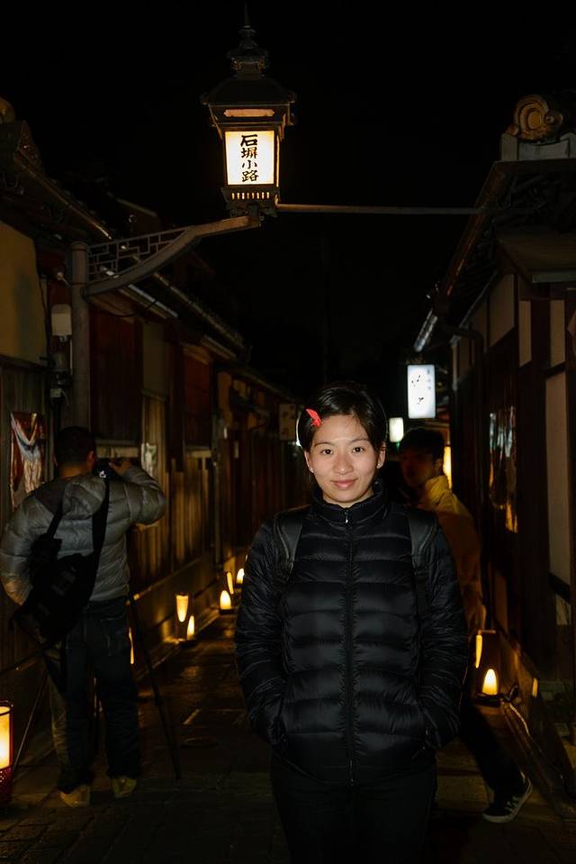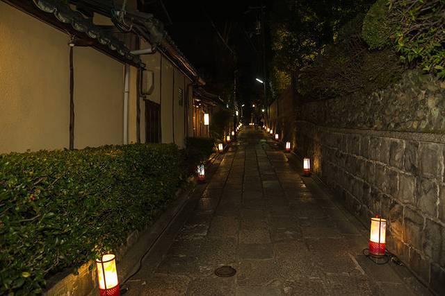 很快经过知恩院,夜场更有气势,我们着实累了也审美疲劳了并未再入,而是沿着石板路静静的走着欣赏着这奇特的景象,还路过一个插花集中展示的公园,影影倬倬的有点奇幻的味道。不过最棒的还是在半路上发现了白天错过的号称最日本的小路“石屏小路”,当当当!在灯光的衬托下,还真有点穿越的味道,和LG手牵手走过这段路程,此中美好无法言表。