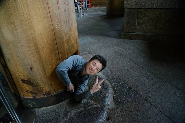 走到殿后,是攻略上说的那根著名的柱子上开的那个著名的洞,据说钻过去的就能心想事成,好运连连。一般都是小孩子玩耍钻钻,我们去的时候几个瘦小的日本老太也在尝试,貌似通过不了。本想看看即可,病号桑这时来了精神,双子二货的本质迸发,也要去钻一钻,脱了外套跃跃欲试,拦也拦不住。于是在一群日本老太的围观下,二货桑侧身挺腰斜里一插居然从那头冒出了他的脑袋,“すごい”的赞叹声立时不绝于耳。