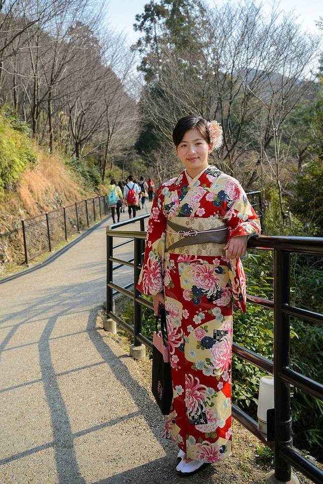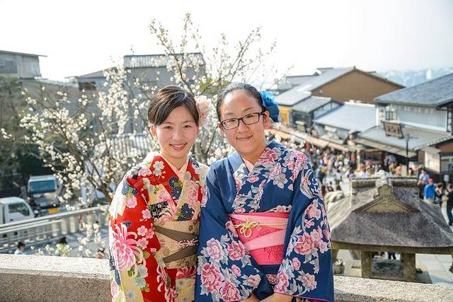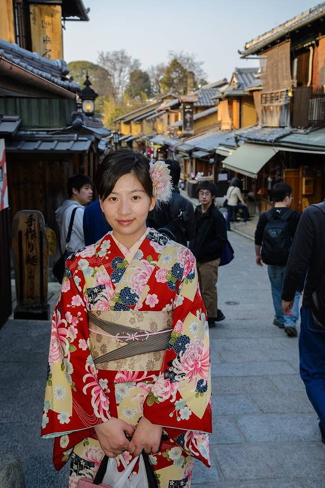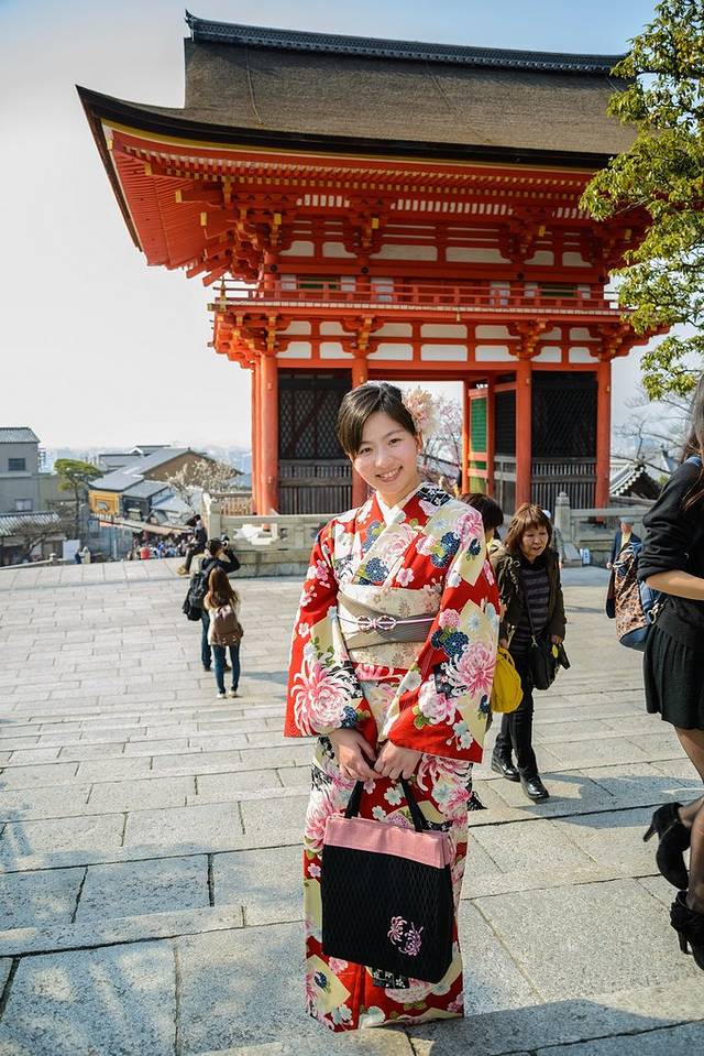 提前撤其实是为了带病号去吃午饭,但是我们居然找不到在google map上定位好的一兰拉面河原町店,尼玛,越急越不顺。只好继续前行,目标是京都的标志景点清水寺旁的和服变身大热店——冈本织物。我们定的是总店,也是网上预约好的,打印后带去就行。清水寺周边果然如攻略所讲都是上坡路,骑上去腿就废了。半路上找到个停车场,当机立断把车给锁了,徒步向上攀爬,好嘛,又是1公里多的坡路,走到和服店我已经面红耳赤累得像狗了。这一天恰逢我们此次日本游最高温最明媚的一天,所以不得不说运气不错哈。只是看着已经打扮完毕的众美女鱼贯而出,我等这副狼狈样就份外刺眼了。