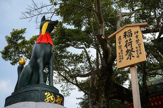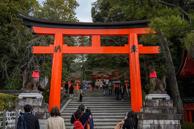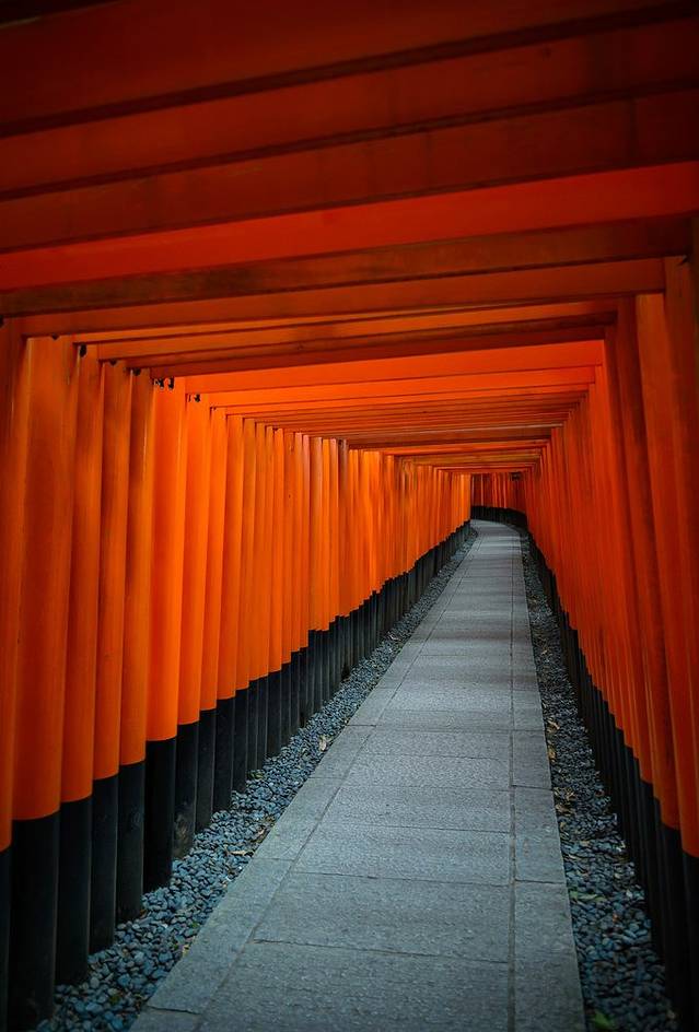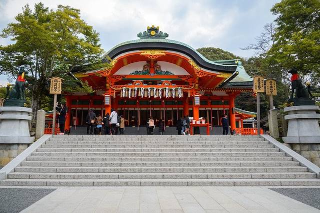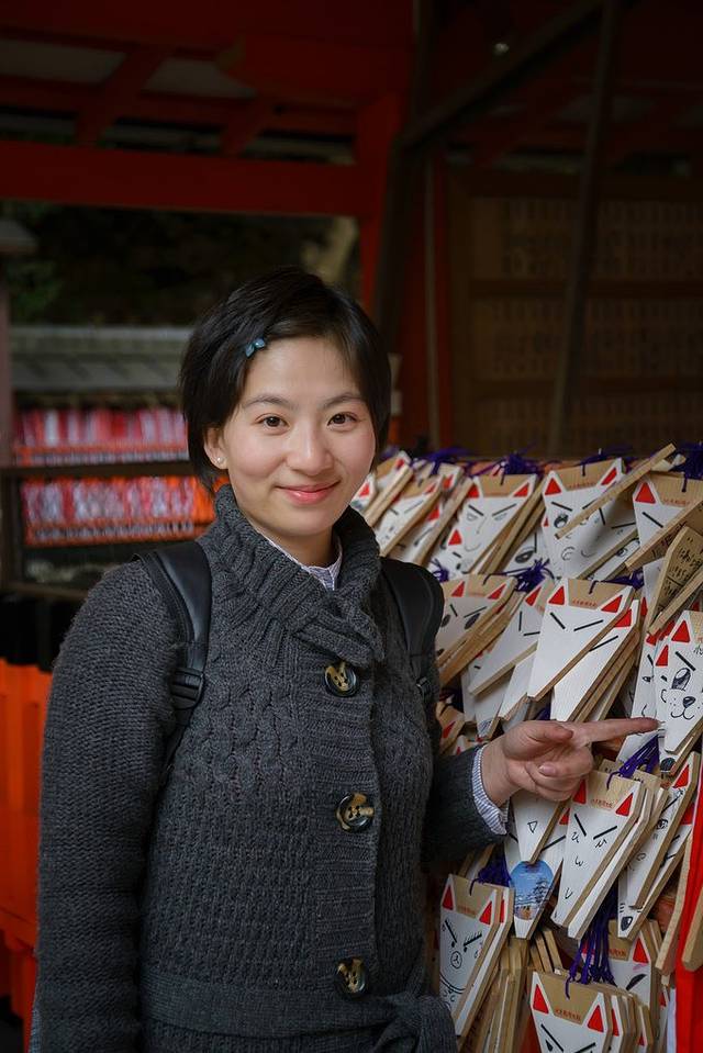 继续行程,锵锵,我最喜欢的橙色的狐狸社——伏见稻荷大社登场啦,火红一片啊!神社就是好啊,没有门票费啊,盘山而上的千鸟居岂是气势两字可以概括啊?去的晚,避开了人流,拍到好多张空旷无人照,high了半天。进到里面,就是传说中被玩坏了的画狐狸绘马的地方了,好好的狐狸都被画上了各种表情,小日本画漫画的功力也可从中窥视一斑。也兴高采烈的加入进去,写下了对家人的祝愿,郑重其事的挂了上去,摇了铃铛,双上合十,希望往后的日子都能像现在这般美好,阿门。