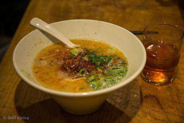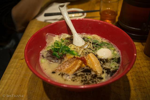 面不贵,最丰盛的也就1100吧,当然点它啦,要的是赤丸,追加糖心蛋,这个必须有。同伴还点了小煎饺,尝个鲜吧。面很快上来,泛着泡沫,卖相一般,但靠近后一股肉香顿时扑面而来。食肉动物的我按耐不住,立马开动,那个鲜哟,回味至今。但是最值得一提的是面里的肉,我点的最贵的里面是那种大肉,酥烂,肥肉相间,但丝毫不腻。LG点的是800多的叉烧面,这叉烧香嫩可口,也完全不输我的,我靠,这些肉下肚,《中华小当家》里夸张的吃了食物后的幸福感顿时体会到了一二。一风堂,必须点赞!至于煎饺嘛,还OK啦,挺好吃,但不惊艳,天朝比它好的不在少数,拉面则确实无敌了。