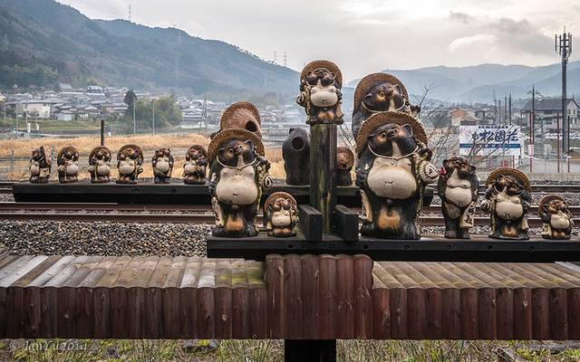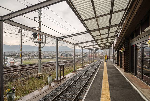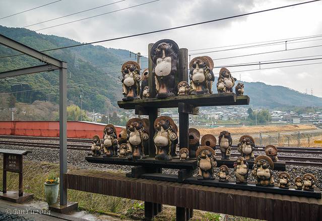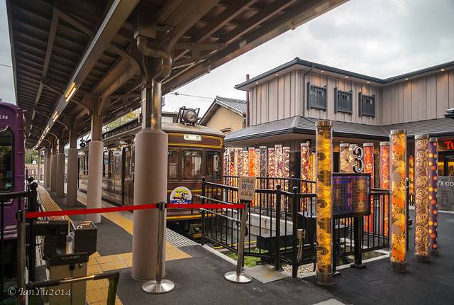 本来说馬堀到亀岡一路有很棒的田园风光,可惜那天是风雨交加,还是快点到暖和和的站厅里等吧。站台里有不少卖纪念品的小店,同伴给她儿子买了个岚山的小火车,挺有意思的。轨道对面就是那个被人拍了无数的“河狸”组合,等车的人纷纷排队合影。再说这个传说中很难买的车票,当天到了一看,票源充足嘛,完全没有必要到关西空港排那么长的队提前买。当然这基于三个前提:1、我们在旺季前2周到达;2、我们要坐的是头班车;3、我们是从亀岡坐的返程。再加一个,出发时下着雨。若不是如此,是否要提前买票还请各位慎重斟酌。