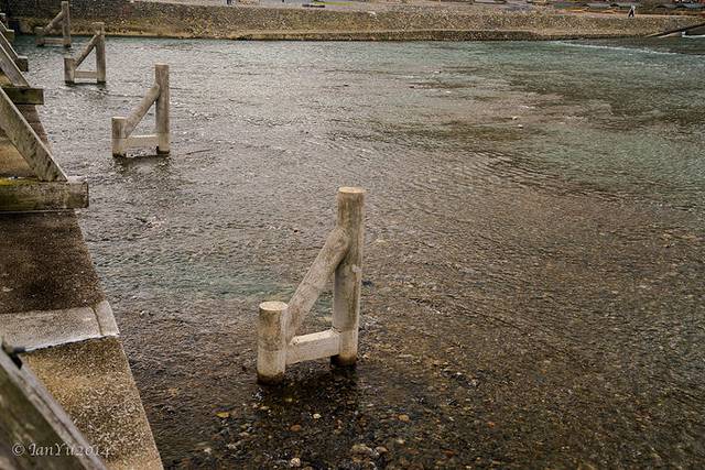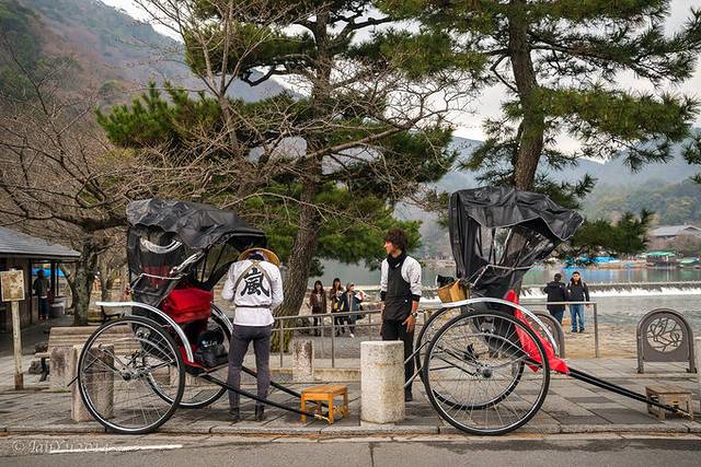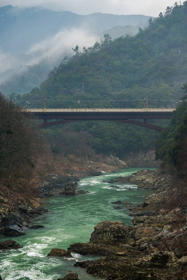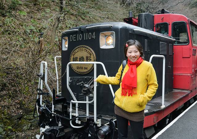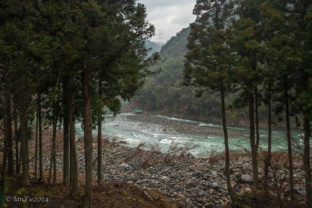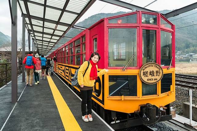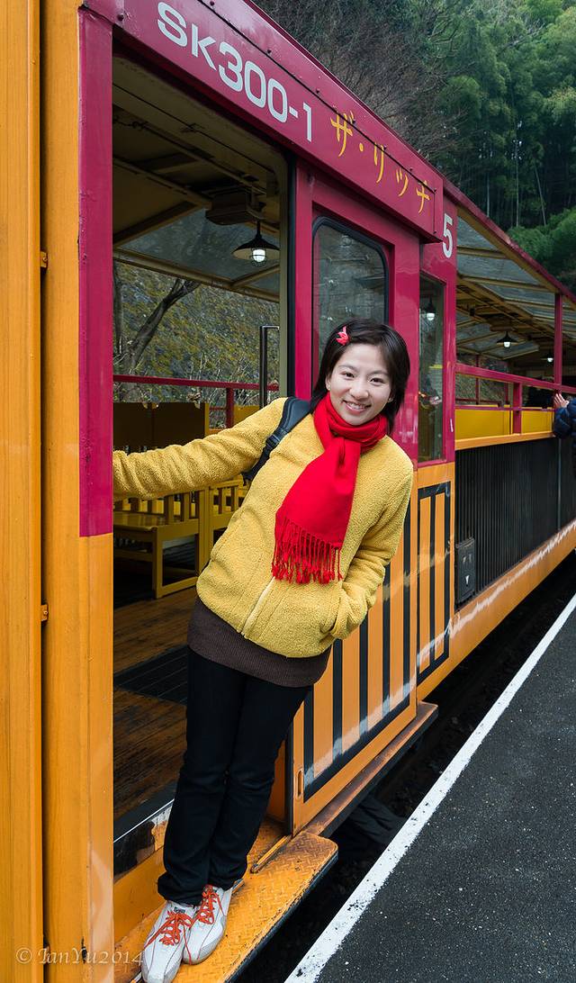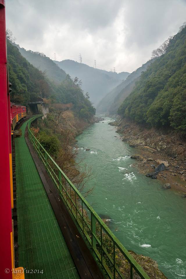 锵锵,小火车准点到站,踩着时间点到车头车尾照了相,然后上车找位置。提前开售的都是1-4节车厢的票子,敞开的5号车厢是当天买才有,没有几个人,不怕风吹雨打的摄影爱好者争先恐后的去了5号车厢。我凑热闹去了一分钟,被风吹得头昏脑胀,逃回了4号车厢,透着玻璃往外看惬意了很多。很快就经过了有名的保津峡,溪水碧绿,两岸青山,还蛮有味道。但说白了,和上海周边那浙西大峡谷区别也不太大,关键是坐着火车看有点意思。看到顺流而下坐船的人们,同伴说要是她就选坐船,我也想坐船,但时间不够啊,漂流的话要2个多小时哦,而且今天这天气坐火车越发明智了。