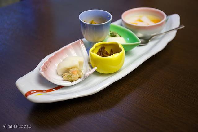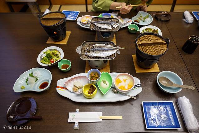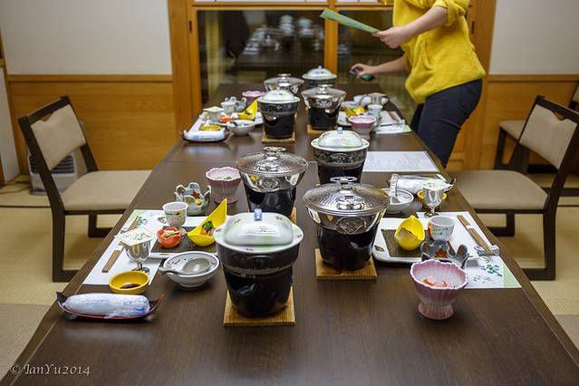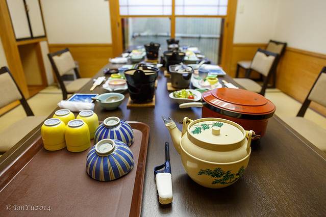 还是昨天那个包间,没有坐到大堂边看富士山边吃饭挺可惜的,但包间私密性好,各有利弊吧。早饭的隆重模式不亚于昨晚,一样是一堆碗碟,晚上吃肉早上吃鱼,我看看就这差别,哦,还有个蒸蛋,那个鲜滑可口哦,面饭主食也一个不缺。看忙碌着的妇人不得空,想自己去泡个茶,结果人家像被触了电似的赶紧把我推回座位。看样子是我越了红界失礼了,sorry啊!