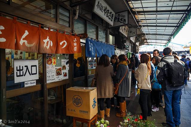 7点不到的东京其实还是蛮清冷的,但鱼市已经热闹非凡,我还没找到寿司大,但心里已经有了不详的预感。在一排排的商铺中晕头转向,还问了人,终于发现了寿司大,哟,门口区区几排人,这算什么,我顿时乐开了花,火速冲上去并呼唤其他人。我的嘴还没合拢时,排在前面一小日本做了个手势讲要从最后排起?什么,这里不是最后?回头一看,擦,街角赫然还有一条队伍。原来为了不影响旁边店做生意,大家自觉空了一截出来。跟随那条队伍往后走啊走,越走心越凉,尼玛整整走了2个半街口啊,这要排到什么时候?