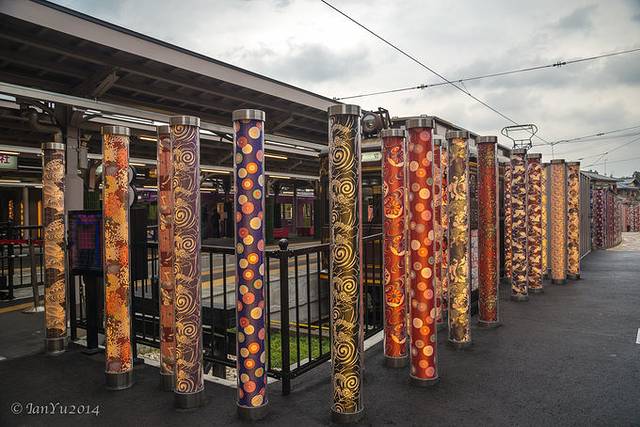 下午本安排了仁和寺、龙安寺和金阁寺,但好么审美疲劳上来了,砍掉前面两个,就留个不得不看的金阁寺咯,时间一下子充裕了起来,总算是不用开挂暴走了。晃晃悠悠到了岚电的车站,五颜六色、色彩缤纷,好漂亮的一个车站。这京福电车就更萌了,紫色系,而且好么,就一节车厢,害得我们上去下来的反复check这真的是北野线来着。岚电到不了金阁寺,只能再下来换乘公交车,跟着给力的google map到也方便。我们等车之际,合计这多出来的时间怎么打发,叽里咕噜的看着地图之时,一日本老太奋力的踮起脚尖,扒开我们的大背包,要把头探进来问我们上哪,是否需要帮助等等,啧啧,很是感动。再说一次,我喜欢关西人,东京人,恩,差远了嘿!