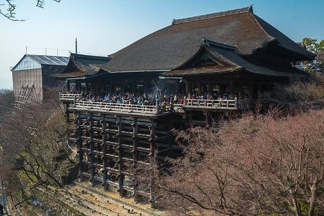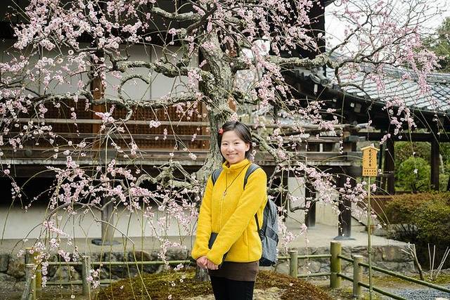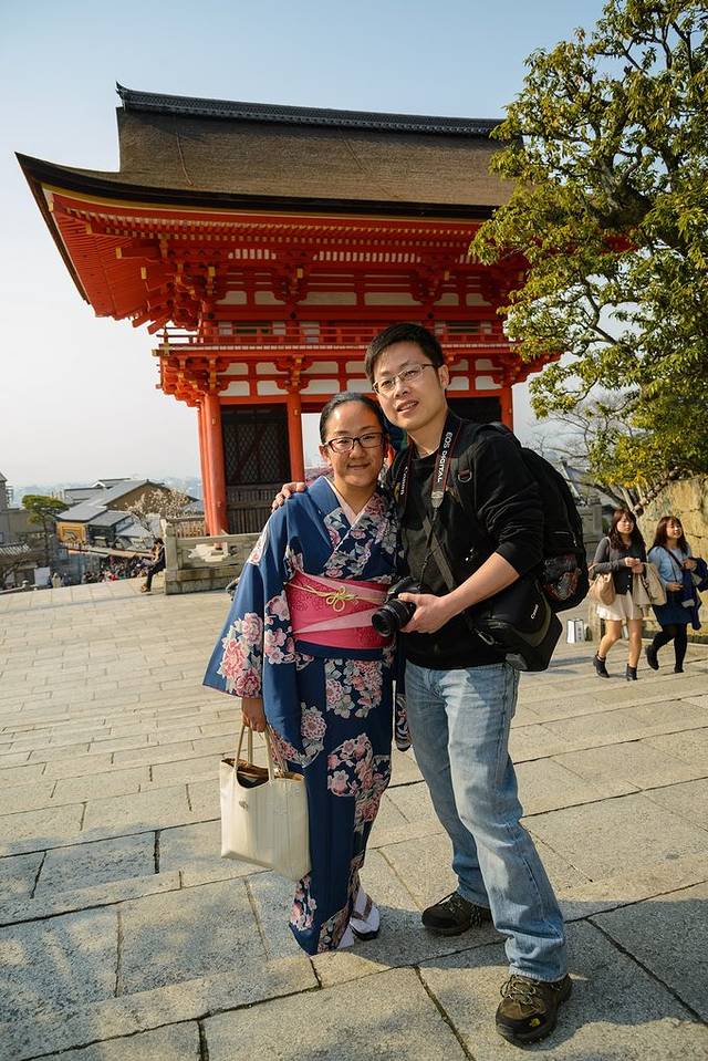 出门两男人非常不给面子的觉得我们这扮相只是soso,好吧,女汉子不需夸奖,依然好心情的迅速吃了点干粮,向京都第一景——清水寺小碎步的走去。这个点的清水寺就悲剧了,people mountain people sea,好在我们的任务更多的是凹造型,so,景是其次啦。门票300块一个人,出奇的便宜,跟着人流经过了地主神社到了清水大舞台。还是这个问题,人太多,索性去买御守,别人托付的“求妹纸”姻缘符在这里搞定。期间还有人上来要求合影,哈哈,心里得瑟一下。继续往前走,回眸就是拍摄远景清水大舞台的好地方,男人们舍弃两伪和服妹抢位置拍照去也,哼。