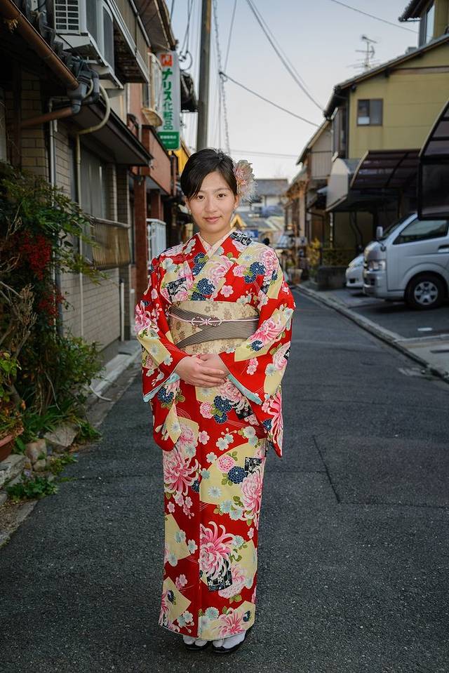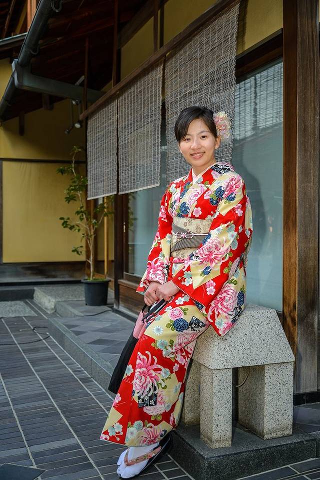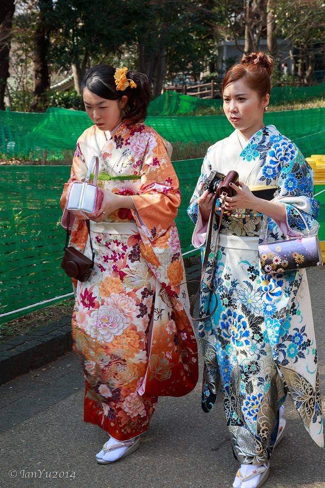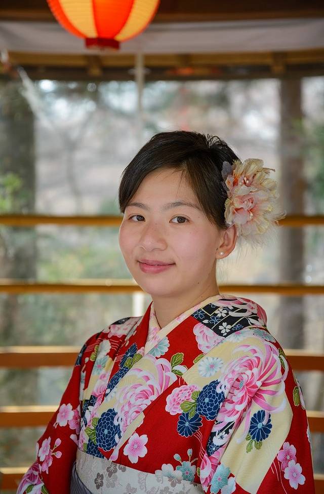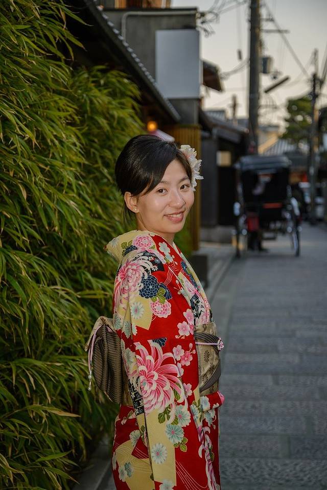 穿穿二十分钟,做头发就略烦了,只有三个人帮着做,而且很多妹纸要求卷头发,所以速度很慢。只好坐在旁边等,这一等发现了问题。话说那天日本妹纸不少,仔细观察,清一色的选的素色小花,又都精心化了淡妆,一个个看上去精致素雅。与前后这些日本妹子相比,坐在中间的我和同伴那一身繁花似锦就活脱脱是花痴二人组了,我是外国人的标志像打在了脸上一样,擦!此时同伴还安慰我,也不全是素的了,你看那边那个枚红色底加全幅大花的不是更夸张咩,没等我心定,那超级大花开始讲粤语了,香港人撒,喟然长叹……