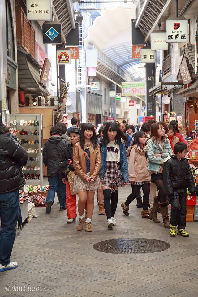 去了一看乖乖,这路两边的小店铺林立,各种促销牌满场飞,人流摩肩接踵,那场面和上海的七浦路有的一拼啊,衣服、鞋子、小配件齐全,便宜货大甩卖,啧,一下子感觉不在日本了,哇哈哈哈。还有卖小吃的摊贩混杂其中,看到不少攻略上的名店,比如吃便宜海鲜丼的;还有各种烤物等,我买了串西瓜,站着吃得西里呼噜,色一啊。
