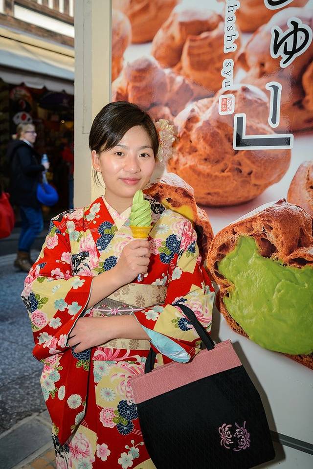 这就大体OK了,把自己的衣物整理到店家给的大袋子里到一楼寄放,然后付钱,我们选的都是最贵最复杂的,5250一个,加做头发500,一共是5750一个人咯。票货两清后,选了手袋外加木屐,店家嘱咐晚上7点前要回来就花枝招展的走鸟。话说穿成这模样,你还真折腾不到那么晚……