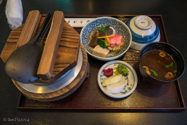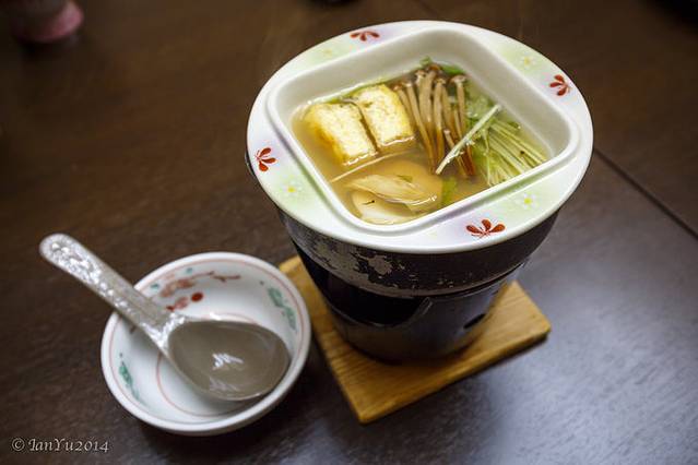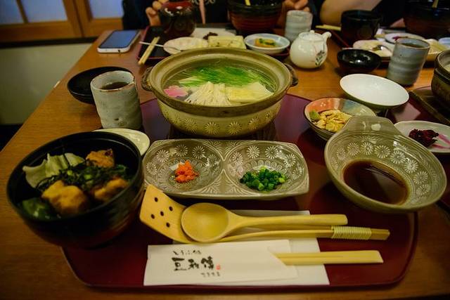 酒店稍作休息后到祗园旁边京都最繁华的河原町吃晚饭,滚滚的鸭川就在旁边。天还有点冷,到了夏天,河床旁都会搭上平台吃饭,多棒啊。河原町在攻略中也有几家相机店可以兜,结果不是没找到就是没有货,唉,对于第一天没有入手6D更加耿耿于怀了,尼玛。这时候只有美食才能抚慰受伤的心灵,京都豆腐料理不能不尝,豆雅传去也。全席用豆腐制成,豆腐拌饭、豆腐锅仔、豆腐汤、豆腐羹、豆腐泥,你能想到的想不到的豆腐做法全部出现了,而且都还鲜香可口,豆腐料理名不虚传。但对男人来讲这顿可能略素了,点起了酒,特产的米酒、柚子酒都上桌,大家干杯以示庆祝,入口口感极好,但要当心,这酒后劲不小,我们的一个队友或许就是因为这口酒倒下的吧。(屁,明明是你的魔鬼行程好伐……)