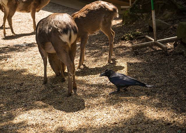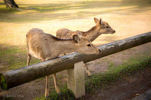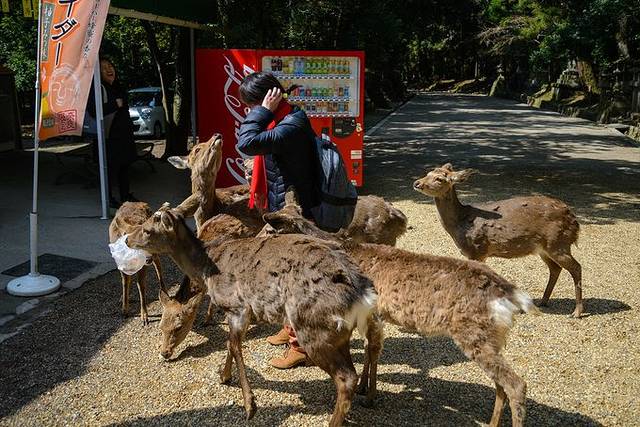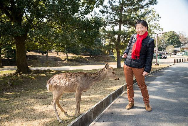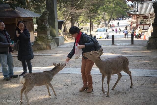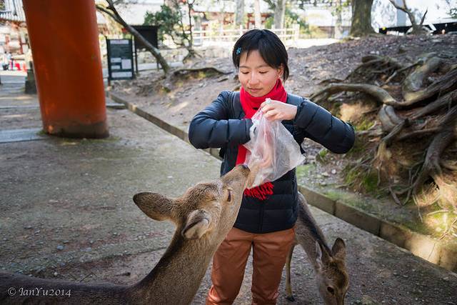 这条路上就有无数奈良的神物——鹿!我兴奋的去买了鹿饼干,果然如攻略所说这些极富攻击性的鹿已经悄然围了过来,我还在付钱,丫的已经用嘴拱我的背包,另一个女友则已经落荒而逃,我买好后立即塞给男人们,自己先跑出安全范围,靠,谁说的,鹿是一种温和的动物?恩?