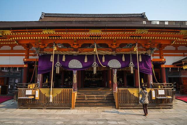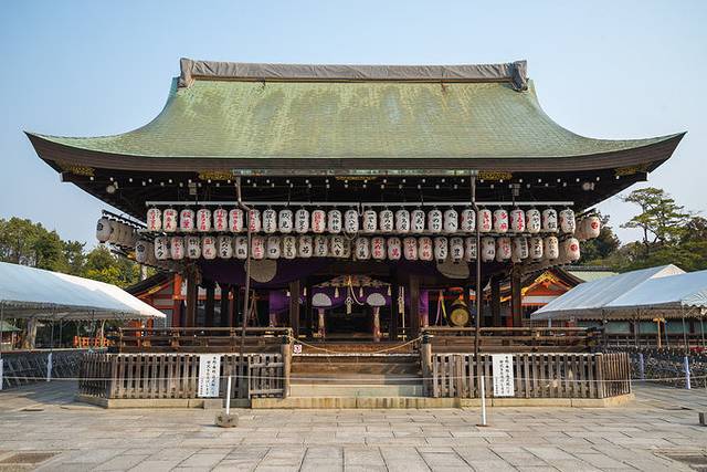 回到酒店,同伴告知一位小伙伴起不来了,只能三人出发,残念残念。跟着google map一路急行,不久就到了八坂神社,本想晚上花灯路再看,但到也到了就进吧,此时停车成了个问题,遍寻不着,只好硬着头皮停在上街沿,导致有着变态道德底线的我一路看得心不在焉,就担心被人抄罚单。其实后来发现景点旁都设有自行车停放处,日本的自行车业还算发达,耐心找找就有啦。八坂神社里还没几个人,似乎是有活动,搭了棚放了座椅,穿着正式的神官巫女忙碌的走来走去,倒也新奇,可惜我太过担心三辆车,匆匆看过就离开了。