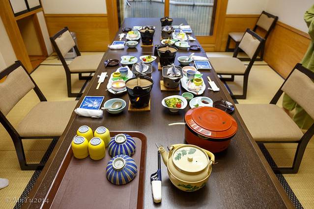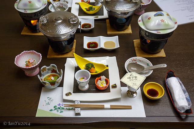 时间不早了,稍作休息就下楼吃饭了,富士吟景晚饭的最晚时间是7点,这也就是我们拼死拼活要从御殿场赶过来的原因!否则你就自动放弃了你的晚饭,如若如此,未免太凄凉了吧。我们的晚饭被安排在一件典雅的全日式房间,门口放着我们的门牌,那一刹那感觉实在是太高大上了。长桌上数量众多的盆碗碟筷已经上桌,精致的日式料理让人垂涎欲滴,一个中年妇女全程为我们服务。知道我稍懂日语,就主要对着我讲解了,我听不明白多少,只好在停顿的地方负责点头,哇哈哈哈哈。