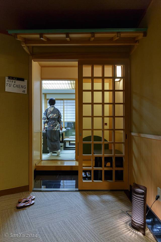 酒足饭饱上去歇息去了,房间里的榻榻米已经铺的整整齐齐,这服务,赞。已经痊愈的病号桑讲这才像话,在京都还要自己铺。一个一晚7500,一个一晚28700,没点差别还好啦?我兴致盎然但费劲地把浴衣给穿上了,还加了外面的短外套,这么一打扮,还真有点小日本的味道,很有趣。温泉旅馆虽然不便宜,但是比起纯五星级多了很多体验的物件,比如这种全席料理、比如浴衣、再来就是我们要去的泡汤啦,大大的赞啊,从性价上说更盛一筹。