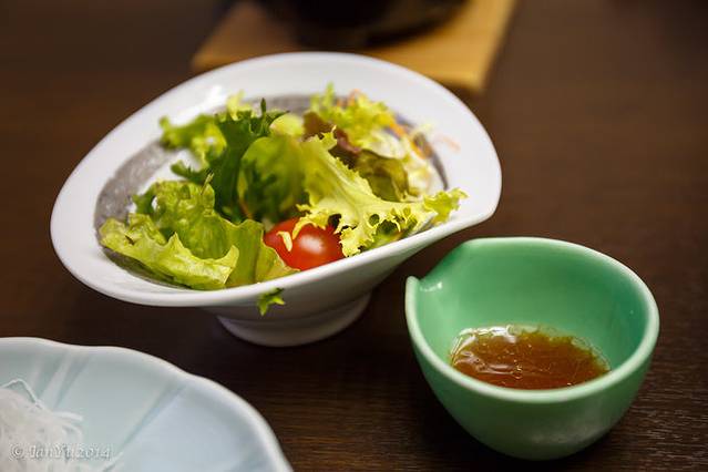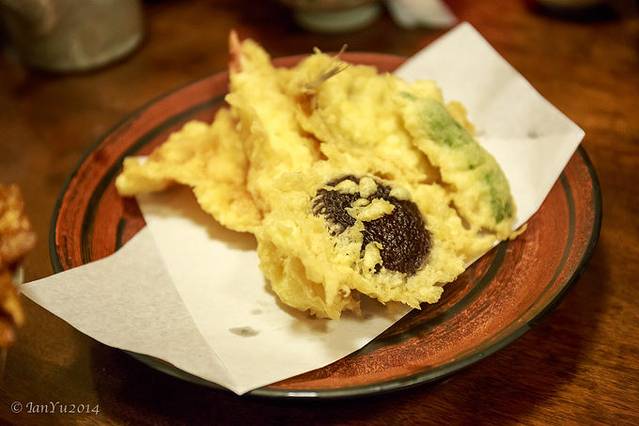终于轮到我们,一看,好大的炸虾天妇罗啊。所谓天丼是酱汁的天妇罗盖饭,饭里也有汁水,很下饭。而天妇罗定食,则是正常的炸虾,沾上美味的酱油,哦依稀的很。虾炸的金黄酥脆,而且不比天朝日料店里的,这个虾品质就是好,个大肉又有嚼劲,外面裹的面粉薄,所以口感很好。个人觉得比天丼里裹了酱油已经软掉的天妇罗好吃很多,定食里好大一盆虾,沾着鲜酱油绝对吃到爽。