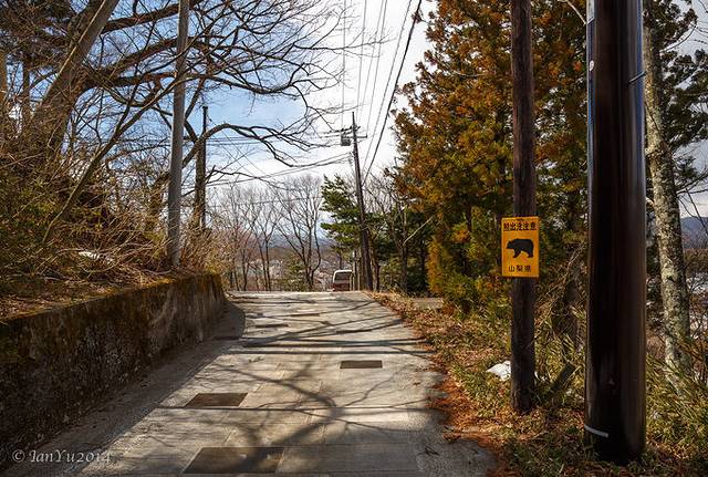 河口湖么,天上山公园的缆车最有名啦,我们第一个要去的就是那里。本还打算租自行车环湖的,结果那天风超大,估量了下这风骑车够呛,最终放弃这个方案,好在google map显示离车站也不远。走了大概15分钟,就到了缆车口了,结果一块醒目的牌子告知今天由于强风,缆车停止!!!靠,什么世道!但我知道除了缆车,徒步上山也是可行的,当下从旁边的步道盘旋而上。