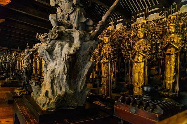 第一站继续搭乘京阪线到三十三间堂下,那个号称日本最长的木建筑。门票600,略贵,但进去一看值啊,大殿里放置千余尊观音,侧面看气势逼人。外场还有个射箭的场地,距离有60米之远,感觉是不能完成的任务,或许只有用大殿背面展示的比人都高的弓才有可能吧?整个建筑造型也很肃穆,远远的一排望去,确实震撼。