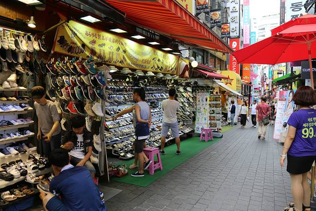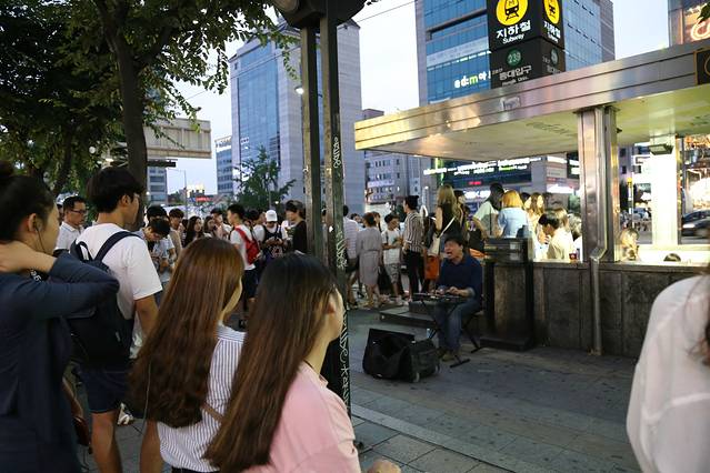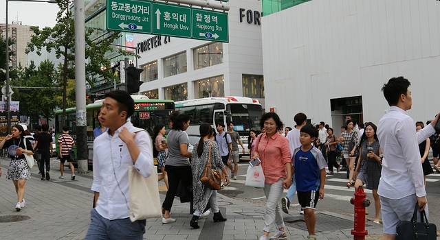 下了飞机,去旅馆放下行李,再到弘大已经是下午五点多啦!不顾旅途的劳顿,看到弘大游人如织,我俩也是莫名的兴奋!本来嘛,这两天是周末,所以到哪儿哪儿都会人挺多的吧!我俩已经做好准备,并且闺蜜是个人来疯,哪儿人多就好往哪儿钻!