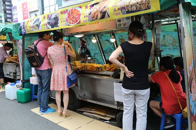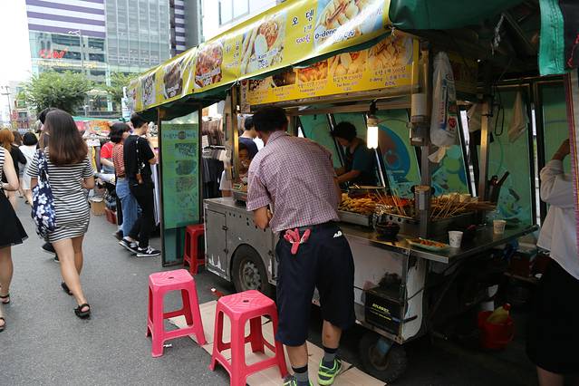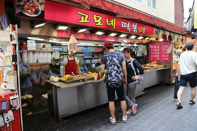 像这样的路边摊,真的是在各处都能看到哦!好多像这样的街头饮食,卖着不同样式的韩国食物,像小鱼糕,炒年糕,烤肉,果汁鲜榨什么的,真的是如果饿了渴了当下就能解决!超方便的!我和闺蜜也吃了一些~但是不能多吃啦,得留着肚子吃晚上的韩餐嘛~
