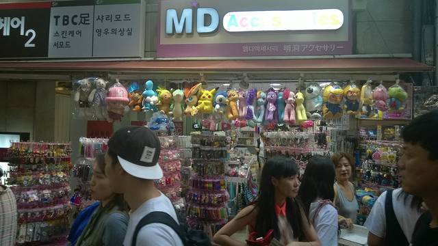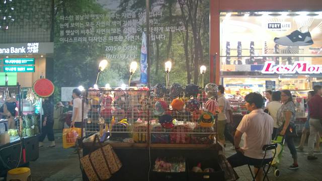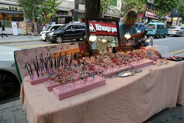 弘大嘛~就是以艺术+年轻为主题的!路边像这样卖着自己手工做的工艺品啦,小饰品的摊子真的是比比皆是!我们去了还看见有人在抱着吉他演唱呢!真的是很好的逛街氛围!
